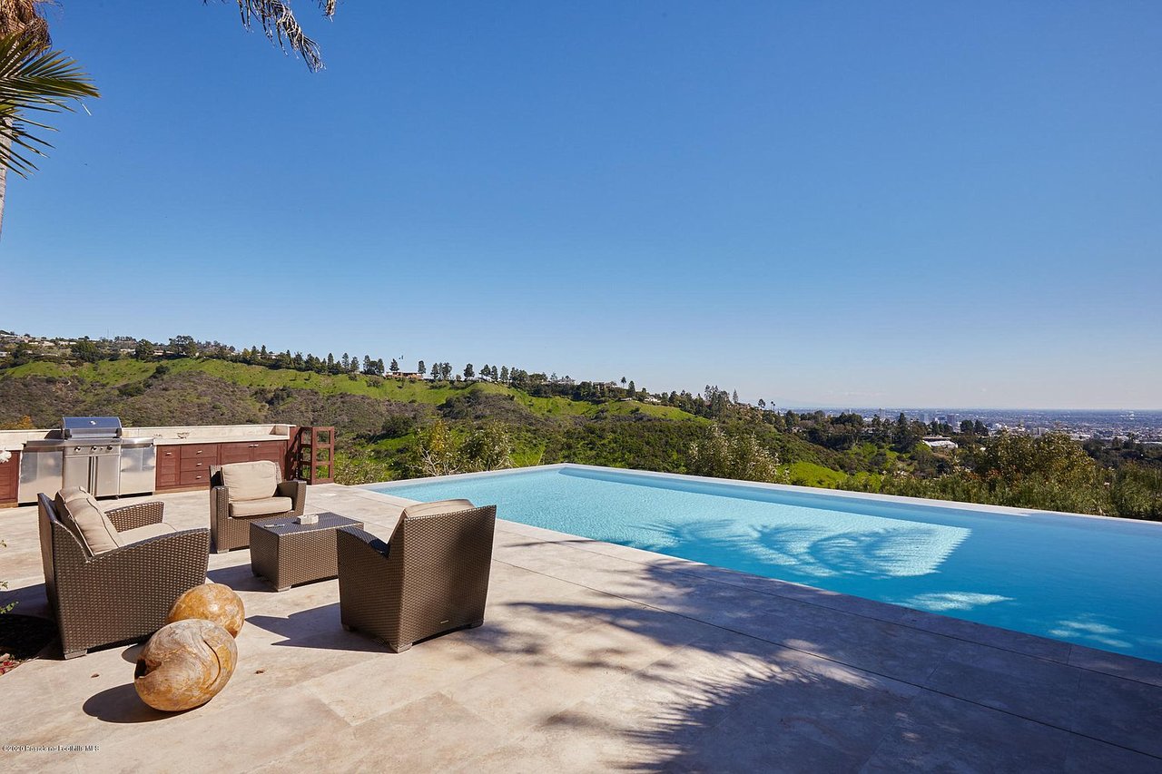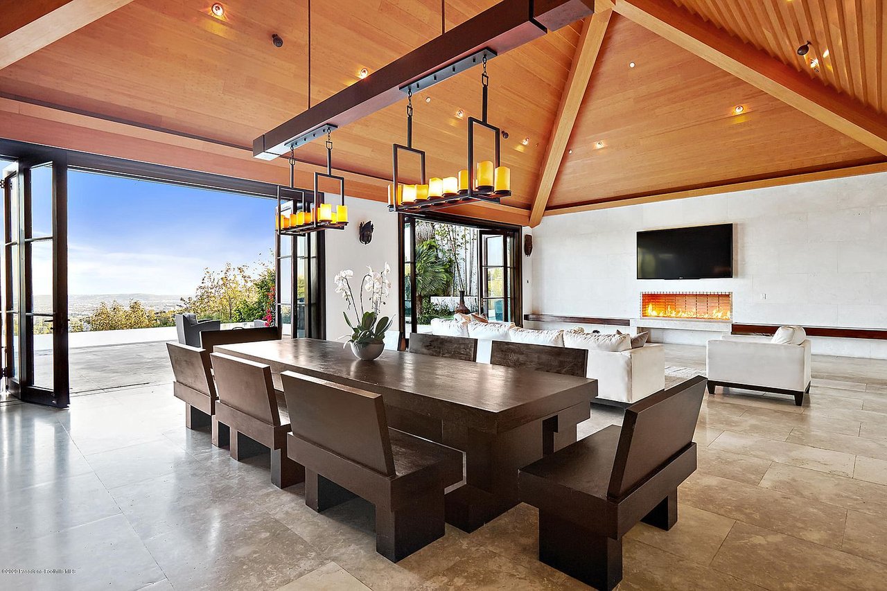 This modern day oasis highlights Balinese architecture with custom features made with imported materials from all over the world. Enter through the front gate and step across a Jerusalem stone bridge above water and lush greenery to reach the main entrance of this architectural tour-de-force. Throughout the estate, floor-to-ceiling glass doors showcase the home's jetliner views. The open concept living room leads into a dining area adjacent to the kitchen. Three of the home's six bedrooms are private suites. The master suite features a private, spacious deck overlooking the city, his-and-hers oversized, walk-in closets, bathrooms and a two-sided fireplace. Additional highlights include a wine cellar, luxurious movie theater and gym. The zen characteristics of the estate flow through the serene backyard. Facing unobstructed city views, the backyard features a waterfall, statue of Buddha and a custom gazebo that stands above an infinity pool and spa. Located minutes away from the heart of Beverly Hills, this contemporary, Balinese-inspired estate offers secluded, luxurious living.