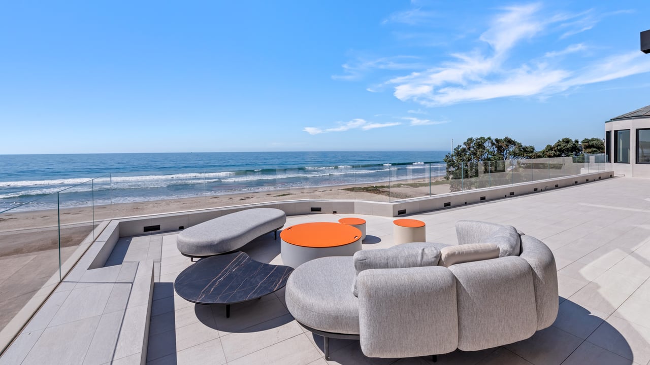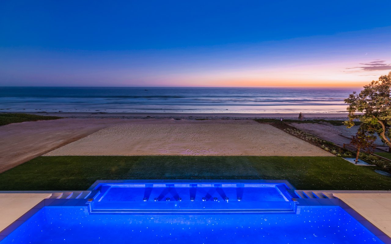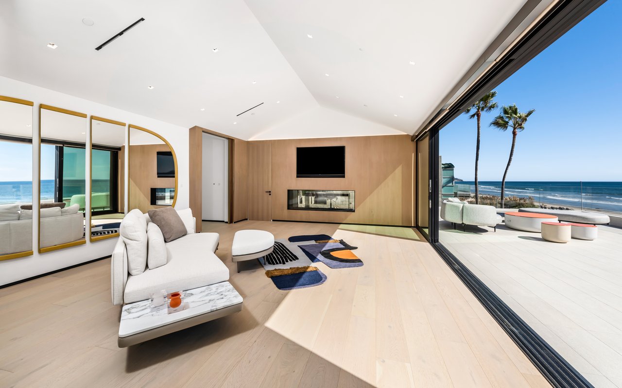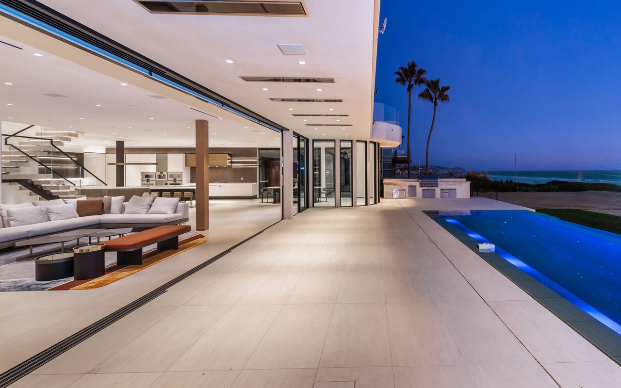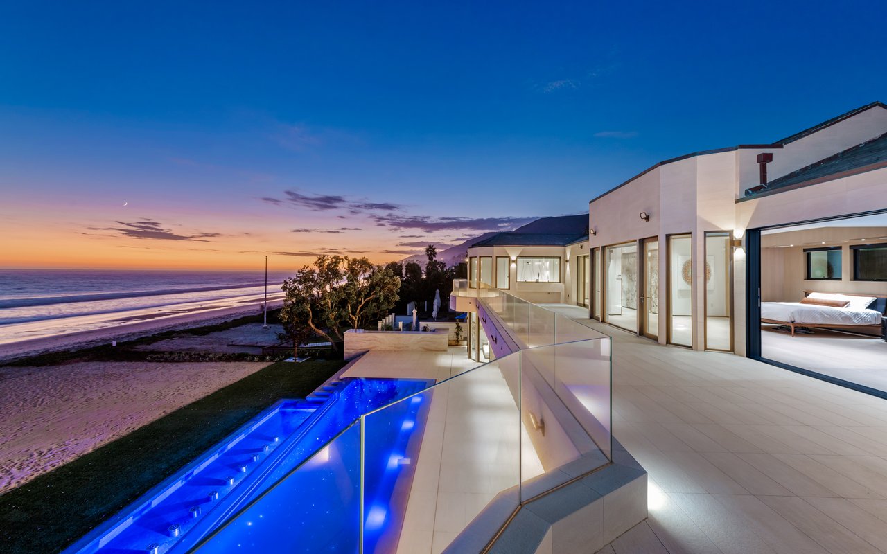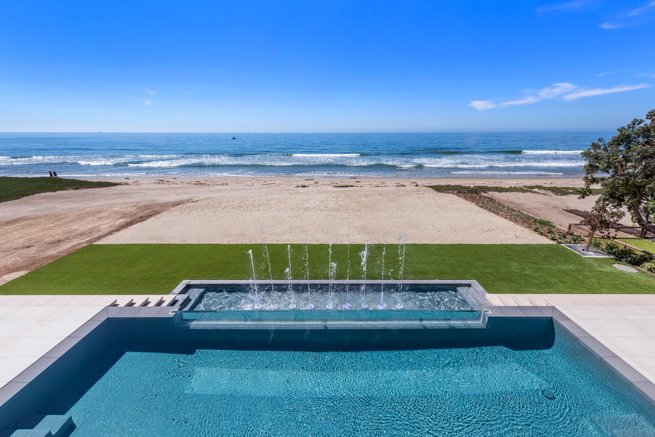 Welcome to your seaside paradise in Malibu! Nestled on nearly 3/4 acre of beachfront bliss, this exquisite property boasts an unparalleled location on Broad Beach. With over 7,600 square feet of luxurious living space, the estate comprises a Main House and a Guest House, ensuring opulence and comfort at every turn. The Guest House, a haven of sophistication, features 2 bedrooms, 2 bathrooms, a well-appointed kitchen area, family room, laundry room, and a security office with a separate bathroom. The main dwelling houses a total of 6 bedrooms, each equipped with ensuite bathrooms. The home's lower level is an entertainer's dream, with a family room featuring a bar, a spacious kitchen adorned with Gaggenau appliances, a dining room offering ocean-view seating, and a living area with a bar and wine closet. A Guest Suite, complete with a seating area, ensuite bathroom with a steam room, and direct access to the pool and beach areas, ensures a seamless blend of luxury and convenience. Upstairs, three secondary bedrooms with ensuite bathrooms, a den with a TV viewing area, and a main suite await. The expansive main suite encompasses a private office, sitting room, main bedroom, two walk-in closets, and a lavish main bathroom with a steam shower and soaking tub. A 1,000 sq ft balcony off the primary bedroom provides breathtaking 180-degree unobstructed ocean views. Completed in 2022, the residence is equipped with state-of-the-art electronics, security cameras, and alarm systems, all seamlessly controlled via a Control 4 app. The Family Room Theater features a 9'x18' video wall with full multiplexing, allowing simultaneous viewing of four events. Outdoor amenities include a zero-edge pool with swim jets, jacuzzi jets, and a water wall in the main courtyard. The beachside entertainment area boasts a built-in barbecue, a 40' infinity-edge pool with a Baja shelf, a dancing fountain, and over 6,000 sq ft of decking and entertainment space. Embrace coastal luxury and create everlasting memories in this Malibu masterpiece.