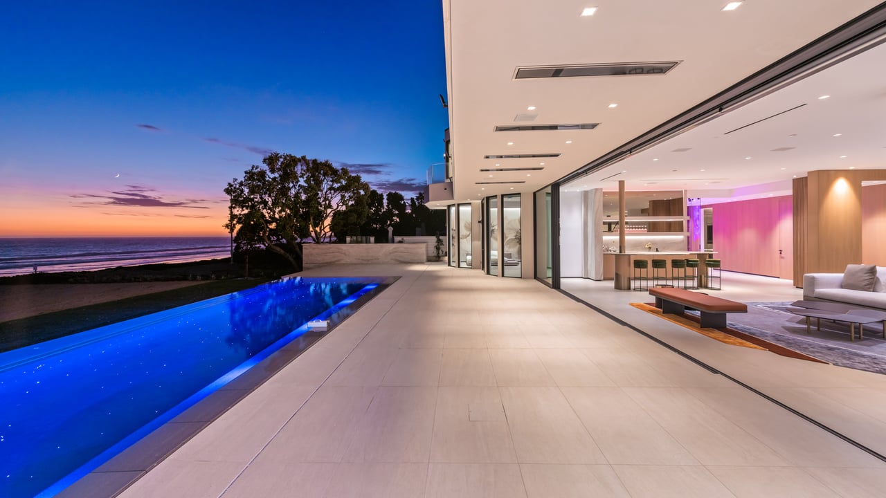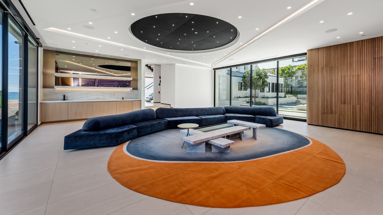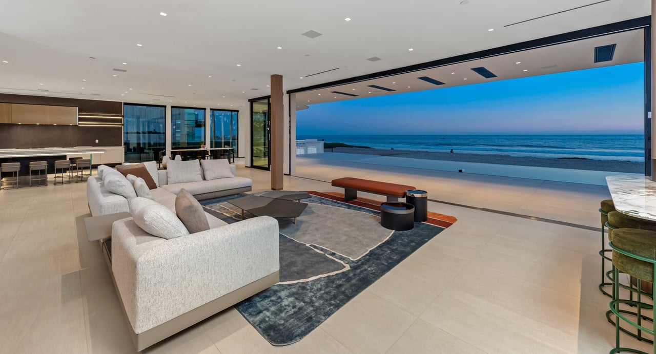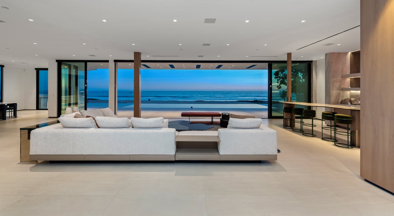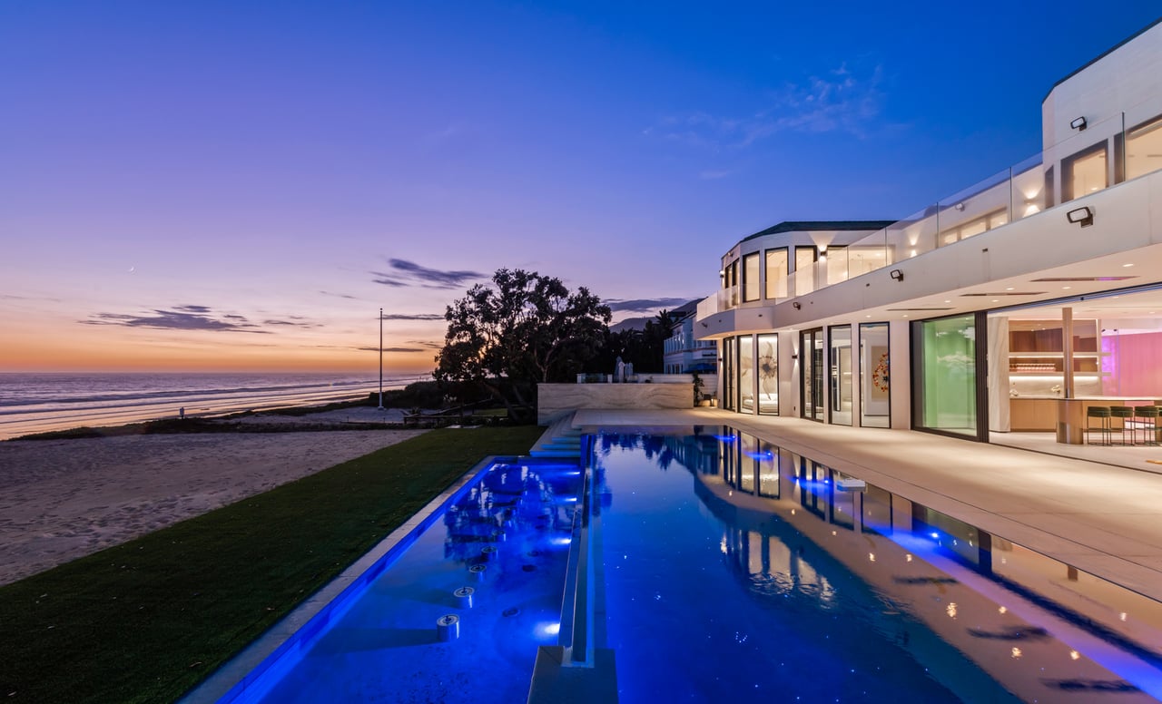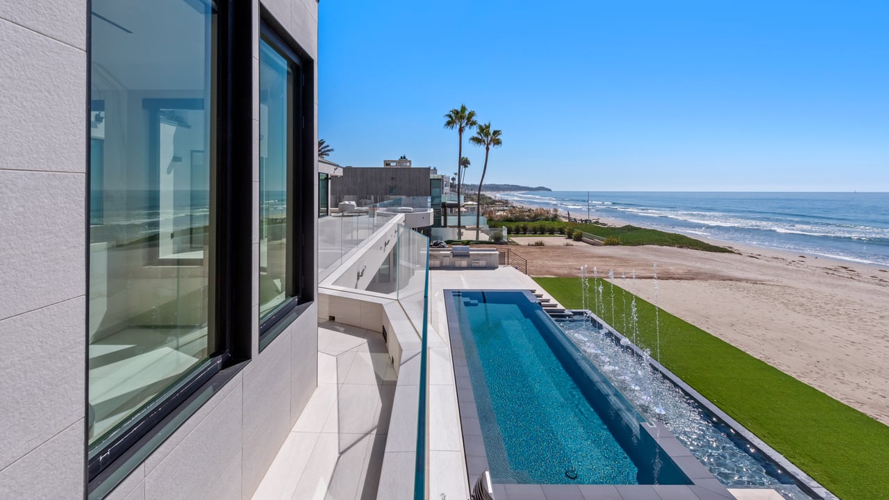 Welcome to your seaside paradise in Malibu! Nestled on nearly 3/4 acre of beachfront bliss, this exquisite property boasts an unparalleled location on Broad Beach. With over 7,600 square feet of luxurious living space, the estate comprises a Main House and a Guest House, ensuring opulence and comfort at every turn. The Guest House, a haven of sophistication, features 2 bedrooms, 2 bathrooms, a well-appointed kitchen area, family room, laundry room, and a security office with a separate bathroom. The main dwelling houses a total of 6 bedrooms, each equipped with ensuite bathrooms. The home's lower level is an entertainer's dream, with a family room featuring a bar, a spacious kitchen adorned with Gaggenau appliances, a dining room offering ocean-view seating, and a living area with a bar and wine closet. A Guest Suite, complete with a seating area, ensuite bathroom with a steam room, and direct access to the pool and beach areas, ensures a seamless blend of luxury and convenience. Upstairs, three secondary bedrooms with ensuite bathrooms, a den with a TV viewing area, and a main suite await. The expansive main suite encompasses a private office, sitting room, main bedroom, two walk-in closets, and a lavish main bathroom with a steam shower and soaking tub. A 1,000 sq ft balcony off the primary bedroom provides breathtaking 180-degree unobstructed ocean views. Completed in 2022, the residence is equipped with state-of-the-art electronics, security cameras, and alarm systems, all seamlessly controlled via a Control 4 app. The Family Room Theater features a 9'x18' video wall with full multiplexing, allowing simultaneous viewing of four events. Outdoor amenities include a zero-edge pool with swim jets, jacuzzi jets, and a water wall in the main courtyard. The beachside entertainment area boasts a built-in barbecue, a 40' infinity-edge pool with a Baja shelf, a dancing fountain, and over 6,000 sq ft of decking and entertainment space. Embrace coastal luxury and create everlasting memories in this Malibu masterpiece.
