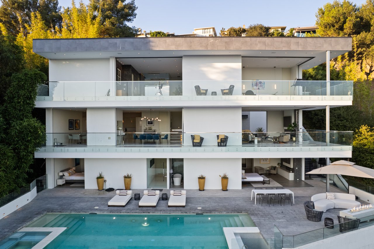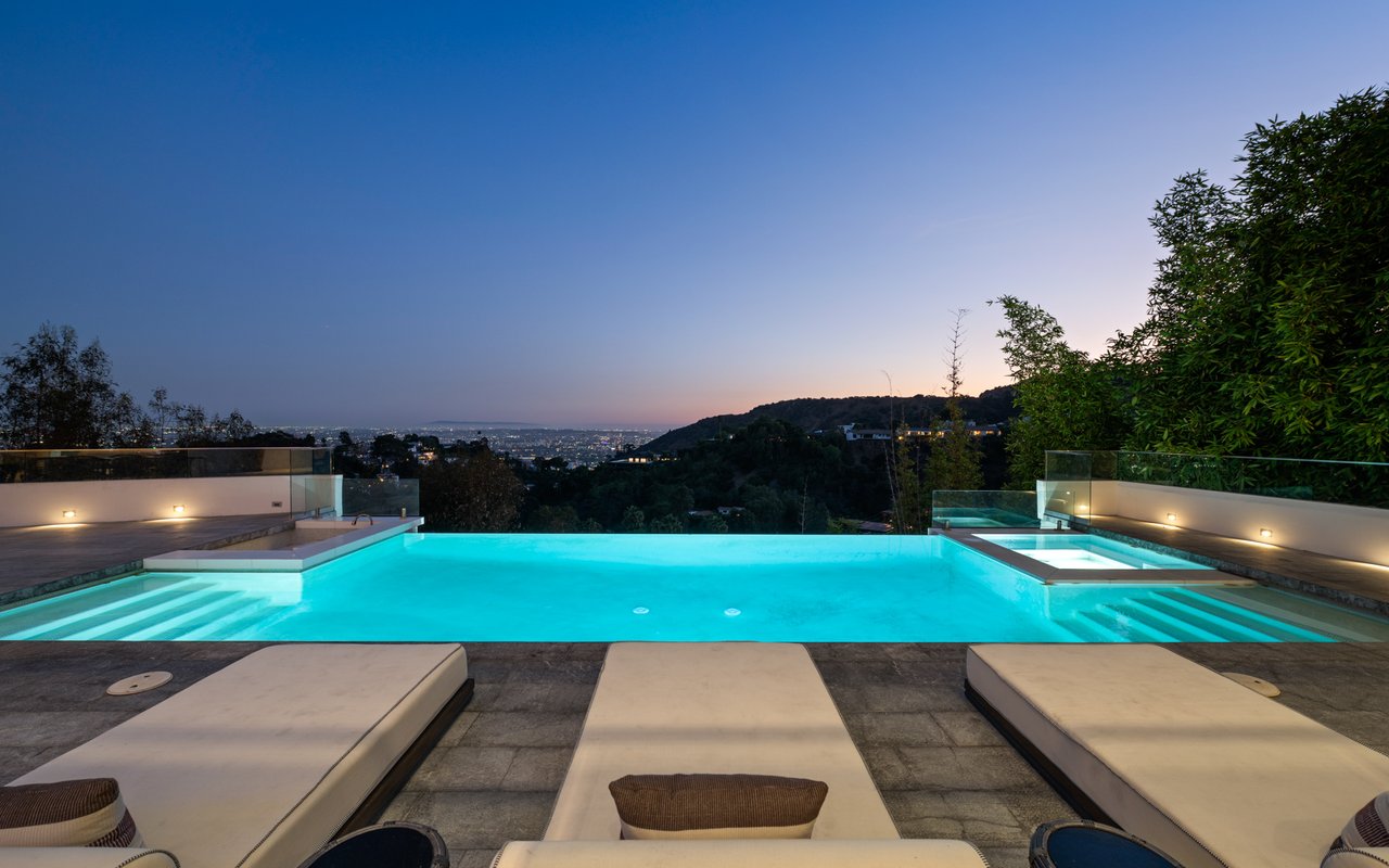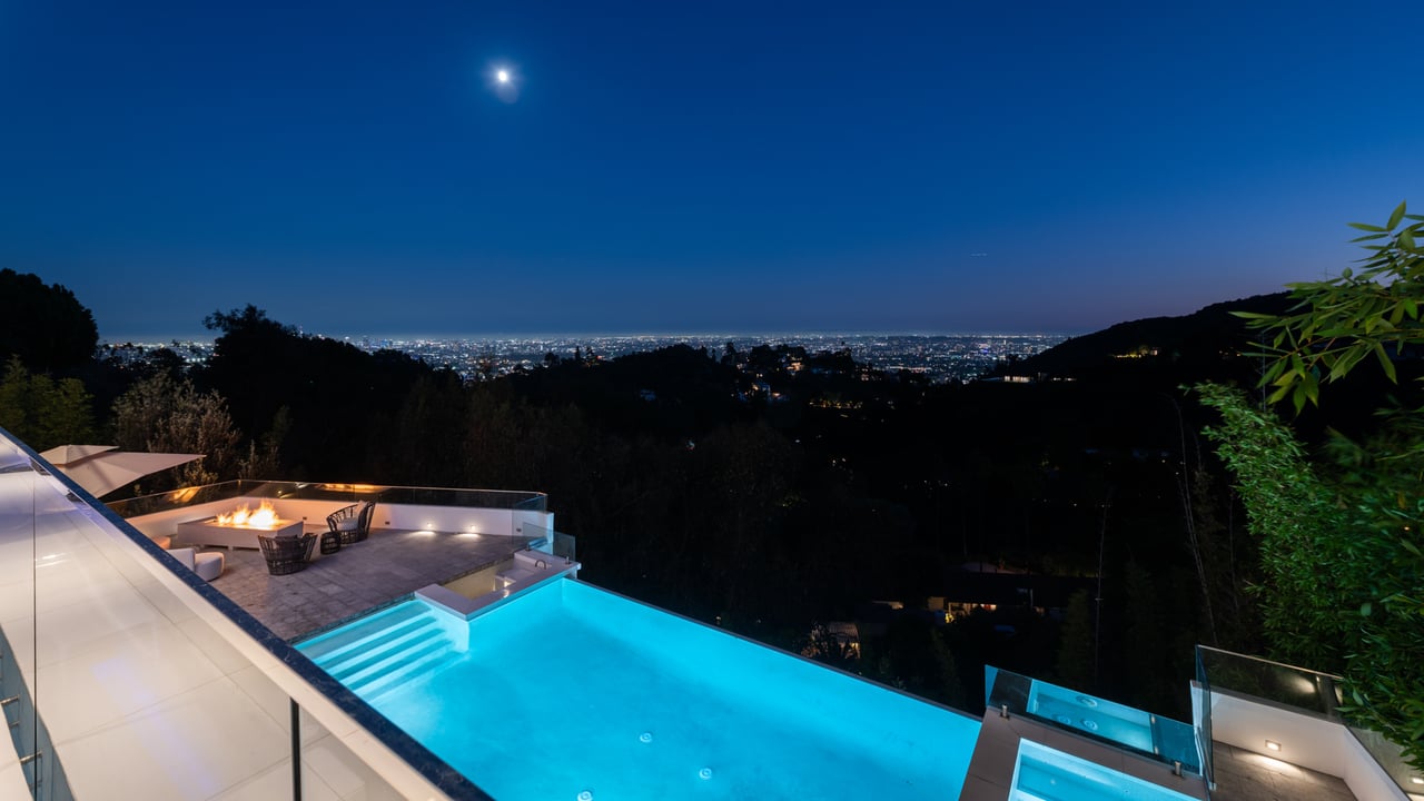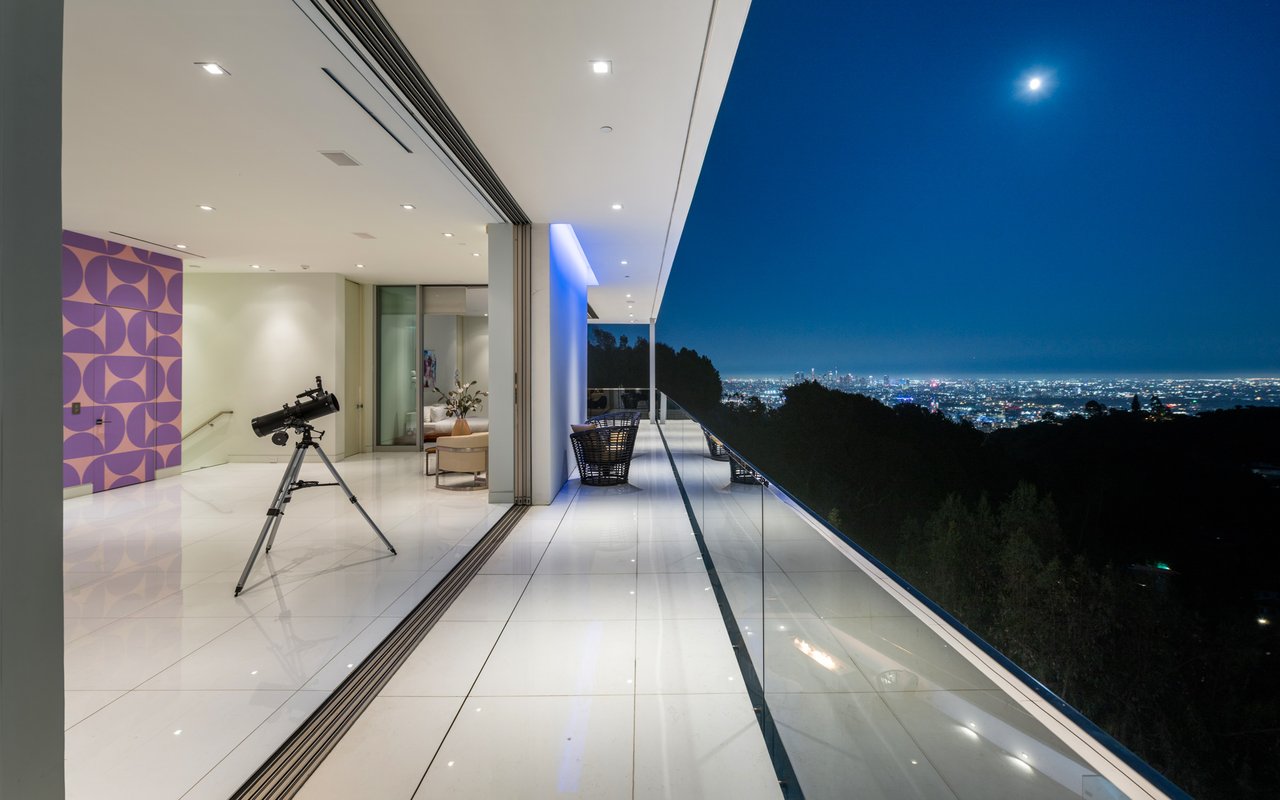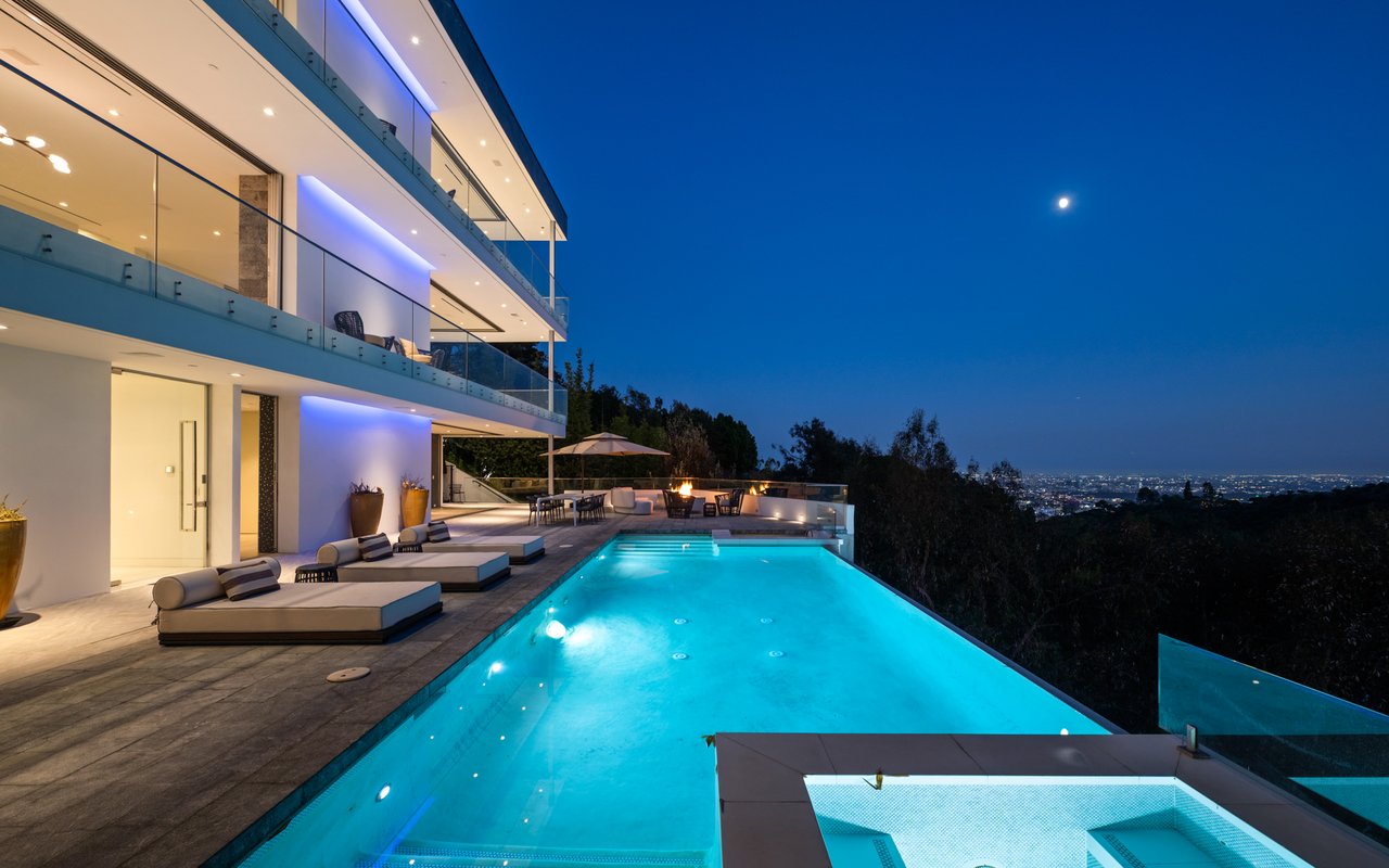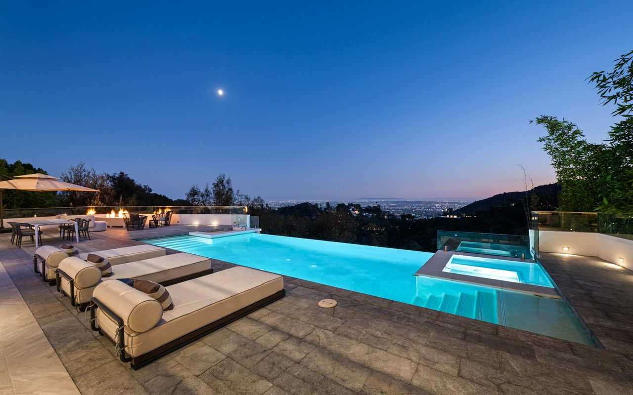 Set at the end of a private, gated drive, this architectural masterpiece offers unparalleled privacy and sweeping panoramic views stretching from Downtown LA to Catalina Island. Featuring three levels of seamless indoor-outdoor living, the home boasts polished white marble floors, floor-to-ceiling glass walls, and stunning vistas from every room. The first level includes a spacious lounge and luxurious bedroom suite. A floating staircase leads to the second level, where a chef's kitchen with high end appliances, custom European cabinetry, indoor/outdoor dining areas, and a private guest suite await. The lower level is a true retreat with two additional bedrooms, including a master suite with direct access to a resort-style infinity pool and swim-up bar. Expansive patios, lounging areas, and a cozy fireplace complete this extraordinary home, designed to captivate and elevate your lifestyle.