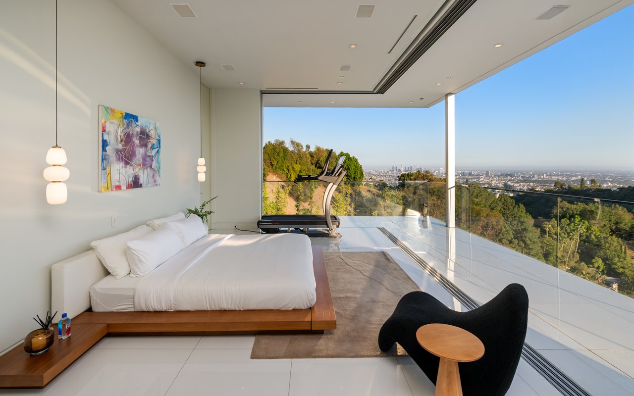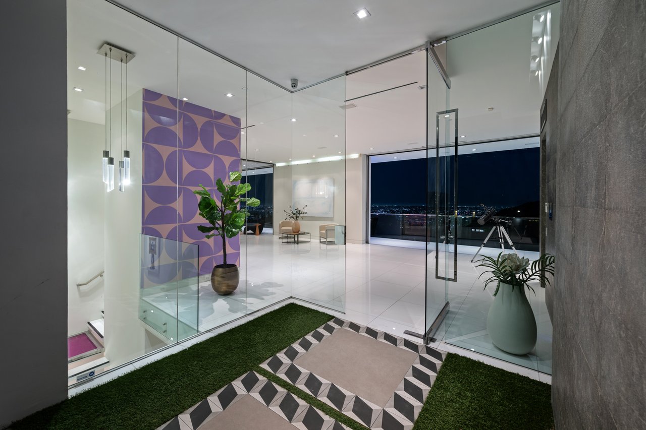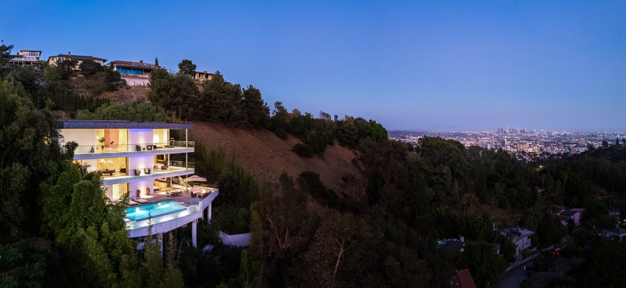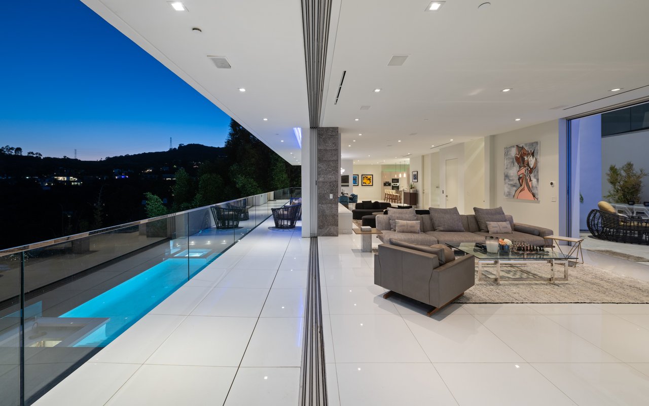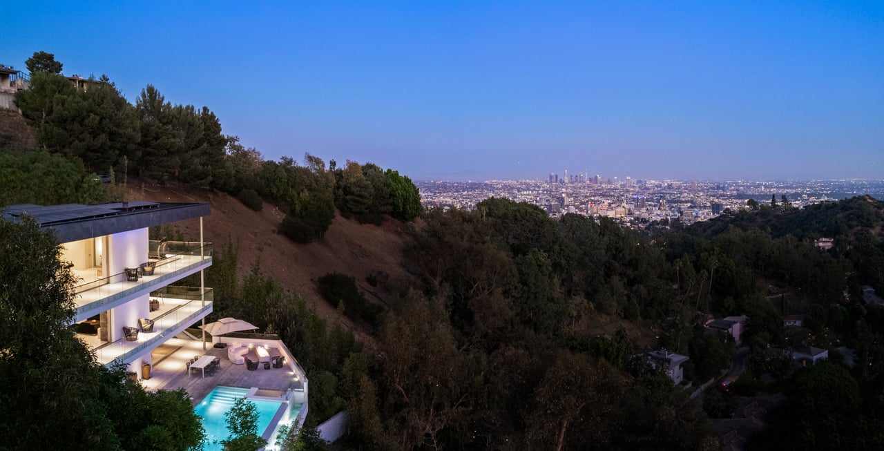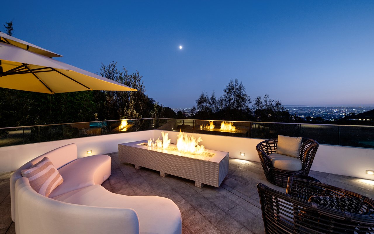 Set at the end of a private, gated drive, this architectural masterpiece offers unparalleled privacy and sweeping panoramic views stretching from Downtown LA to Catalina Island. Featuring three levels of seamless indoor-outdoor living, the home boasts polished white marble floors, floor-to-ceiling glass walls, and stunning vistas from every room. The first level includes a spacious lounge and luxurious bedroom suite. A floating staircase leads to the second level, where a chef's kitchen with high end appliances, custom European cabinetry, indoor/outdoor dining areas, and a private guest suite await. The lower level is a true retreat with two additional bedrooms, including a master suite with direct access to a resort-style infinity pool and swim-up bar. Expansive patios, lounging areas, and a cozy fireplace complete this extraordinary home, designed to captivate and elevate your lifestyle.