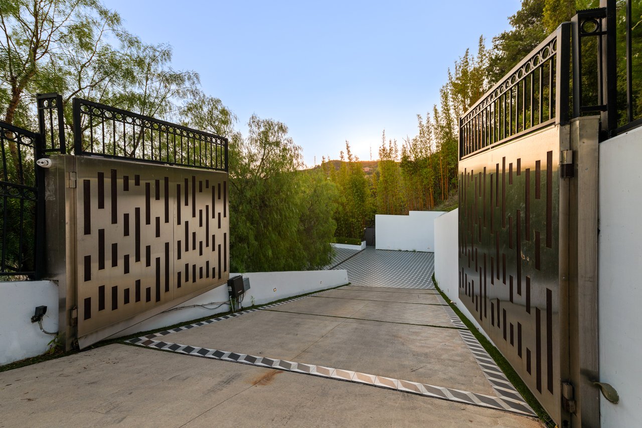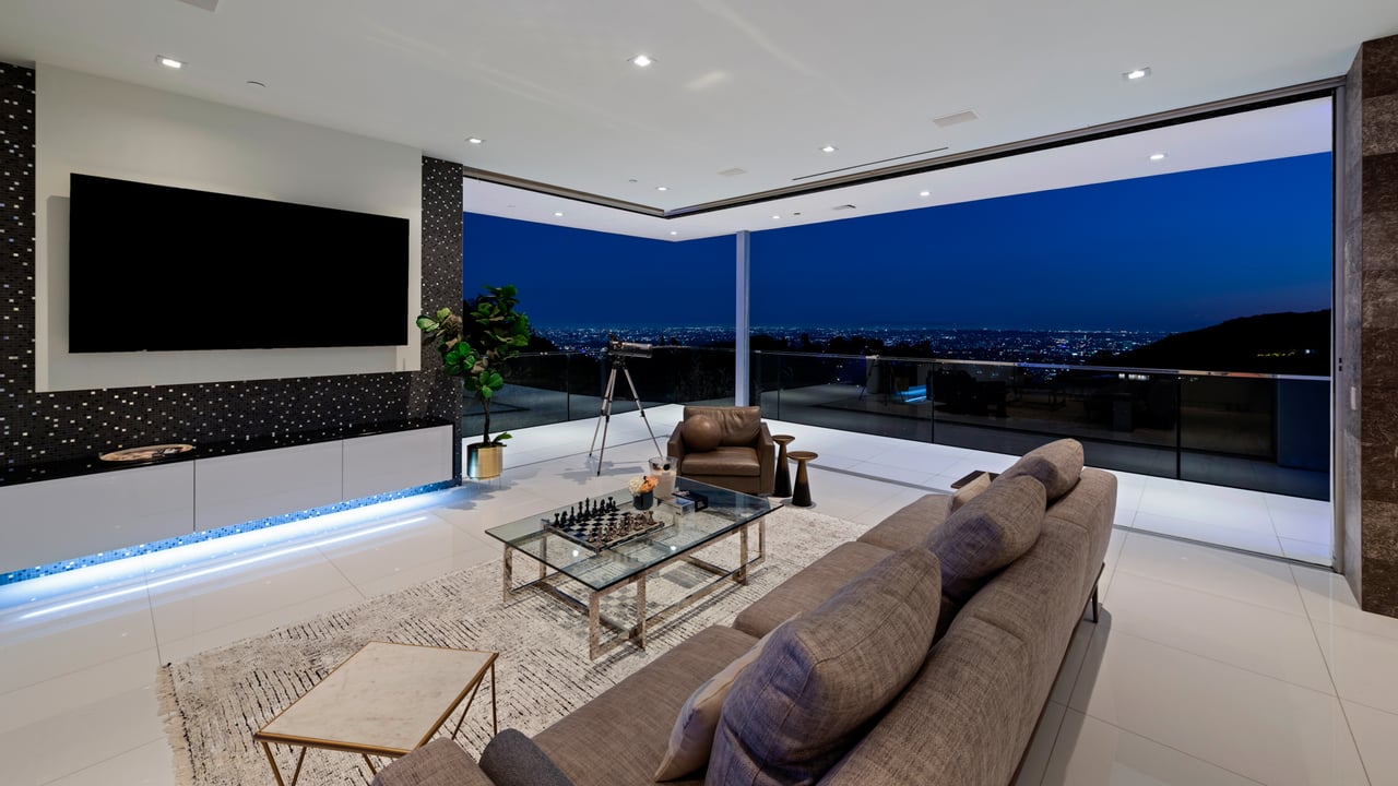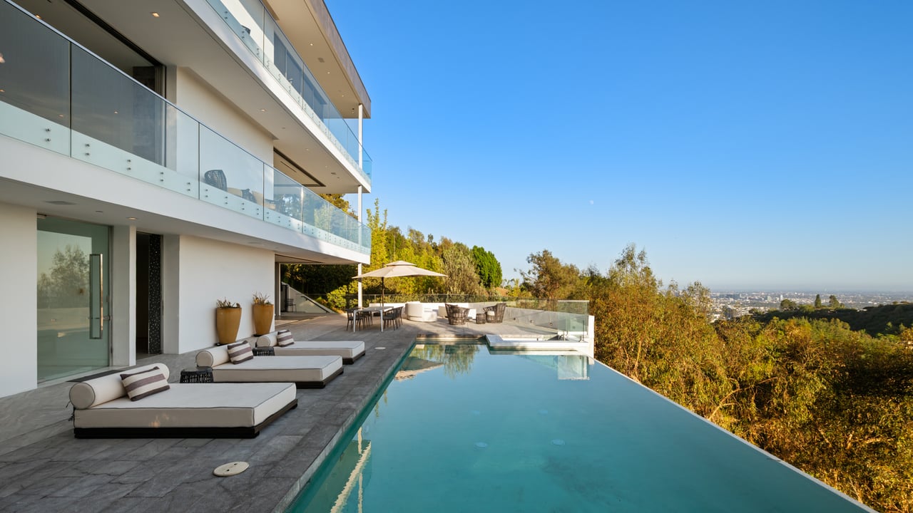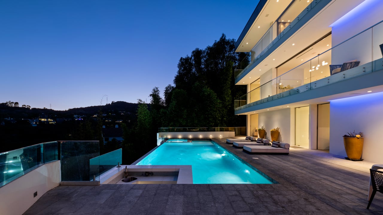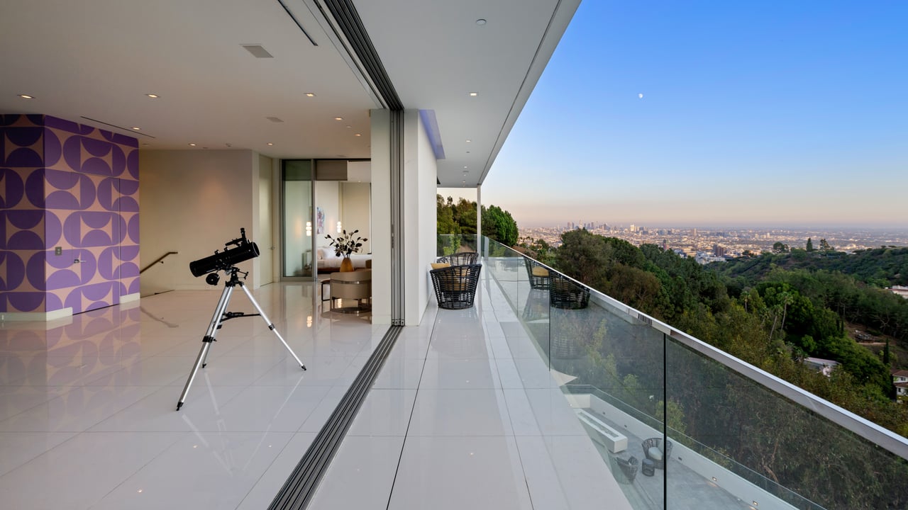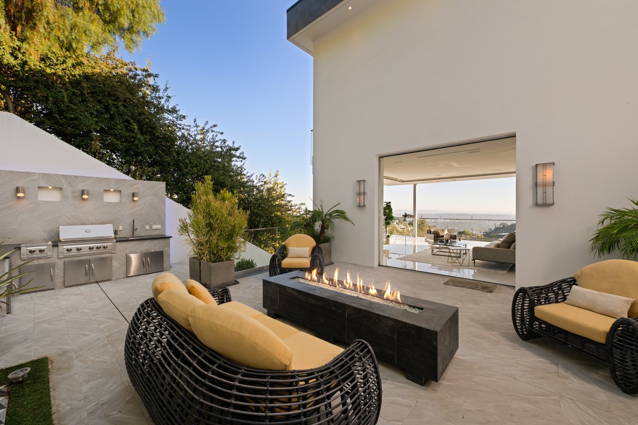Set at the end of a private, gated drive, this architectural masterpiece offers unparalleled privacy and sweeping panoramic views stretching from Downtown LA to Catalina Island. Featuring three levels of seamless indoor-outdoor living, the home boasts polished white marble floors, floor-to-ceiling glass walls, and stunning vistas from every room. The first level includes a spacious lounge and luxurious bedroom suite. A floating staircase leads to the second level, where a chef's kitchen with high end appliances, custom European cabinetry, indoor/outdoor dining areas, and a private guest suite await. The lower level is a true retreat with two additional bedrooms, including a master suite with direct access to a resort-style infinity pool and swim-up bar. Expansive patios, lounging areas, and a cozy fireplace complete this extraordinary home, designed to captivate and elevate your lifestyle.