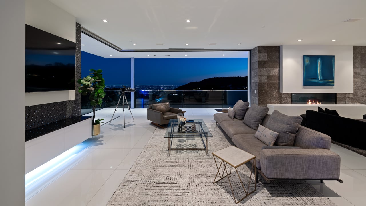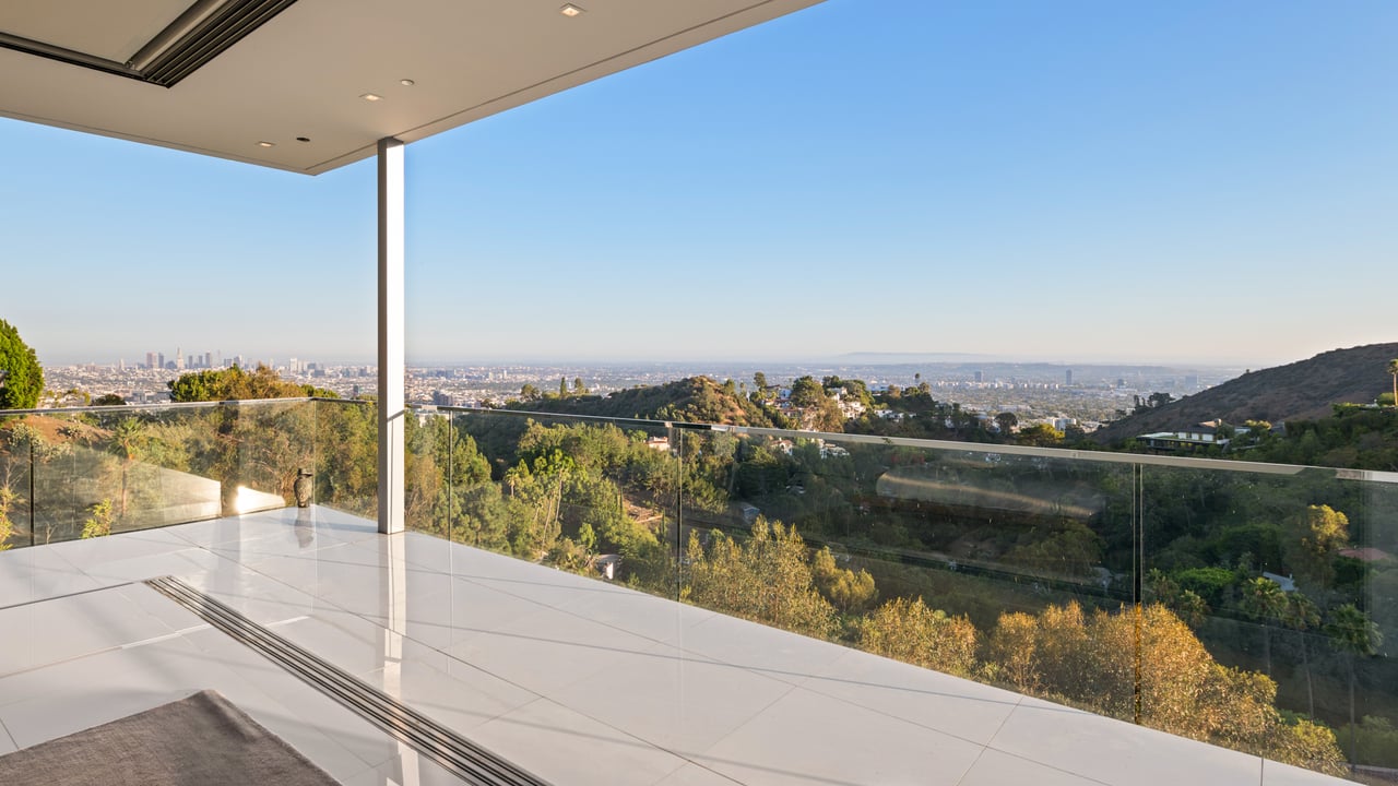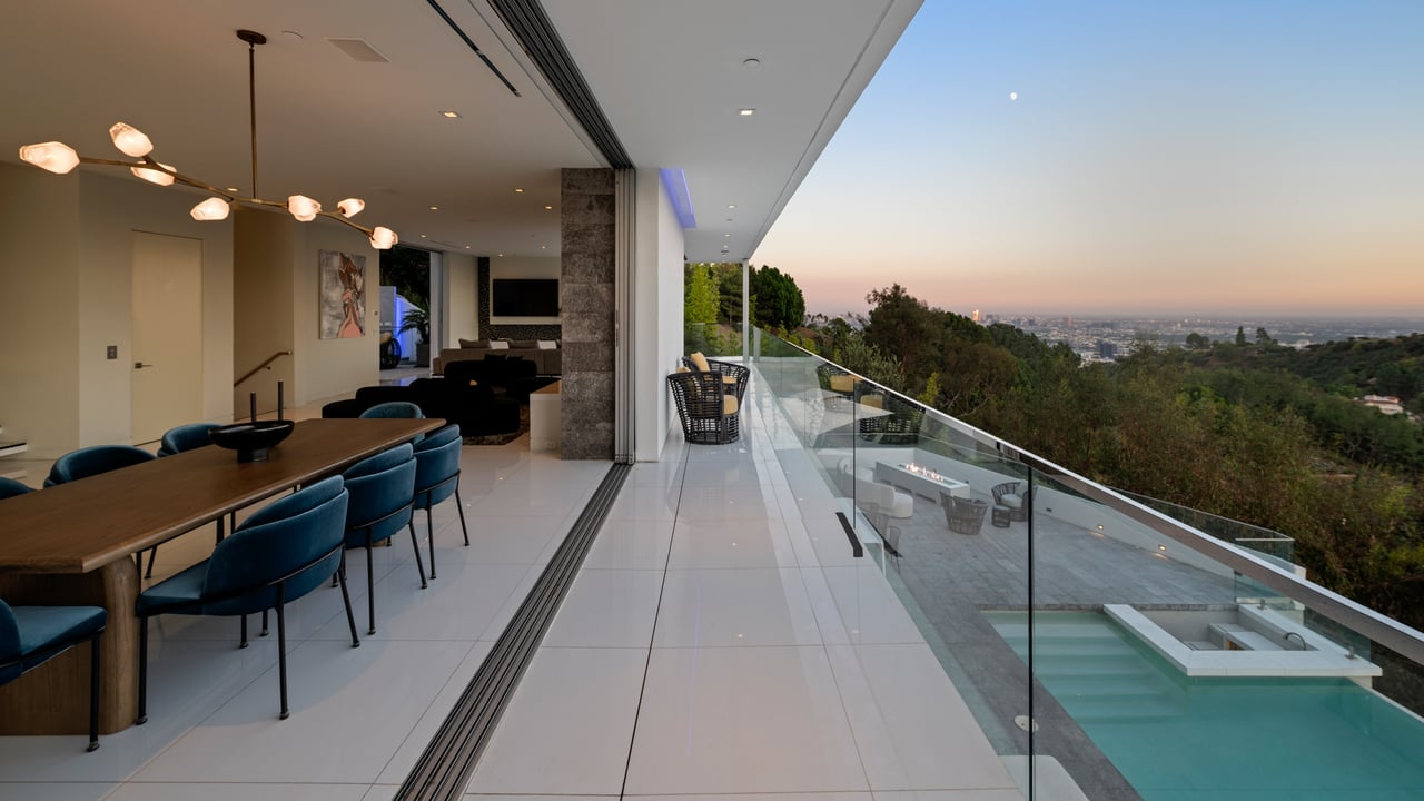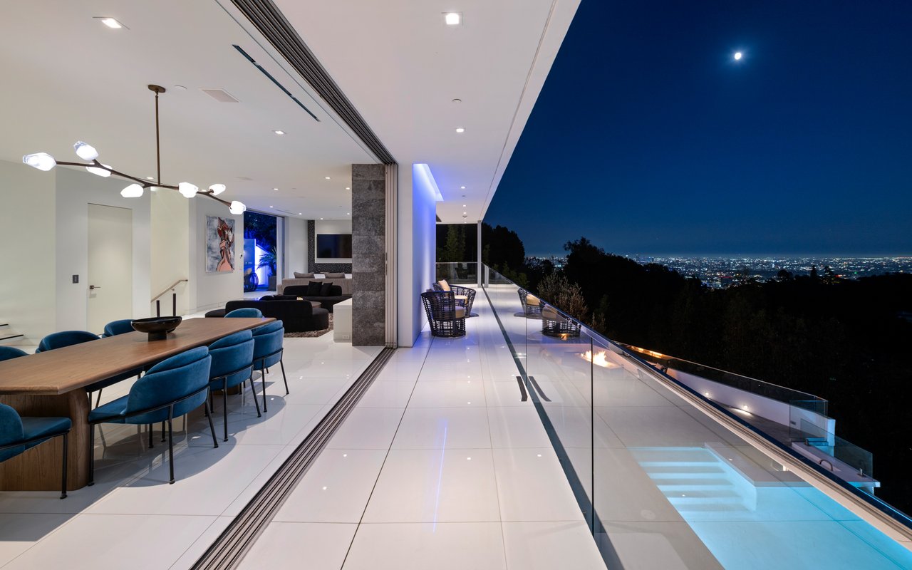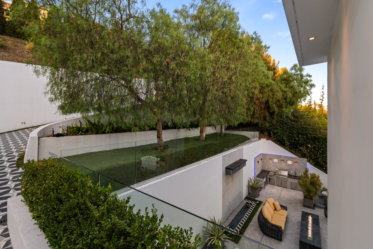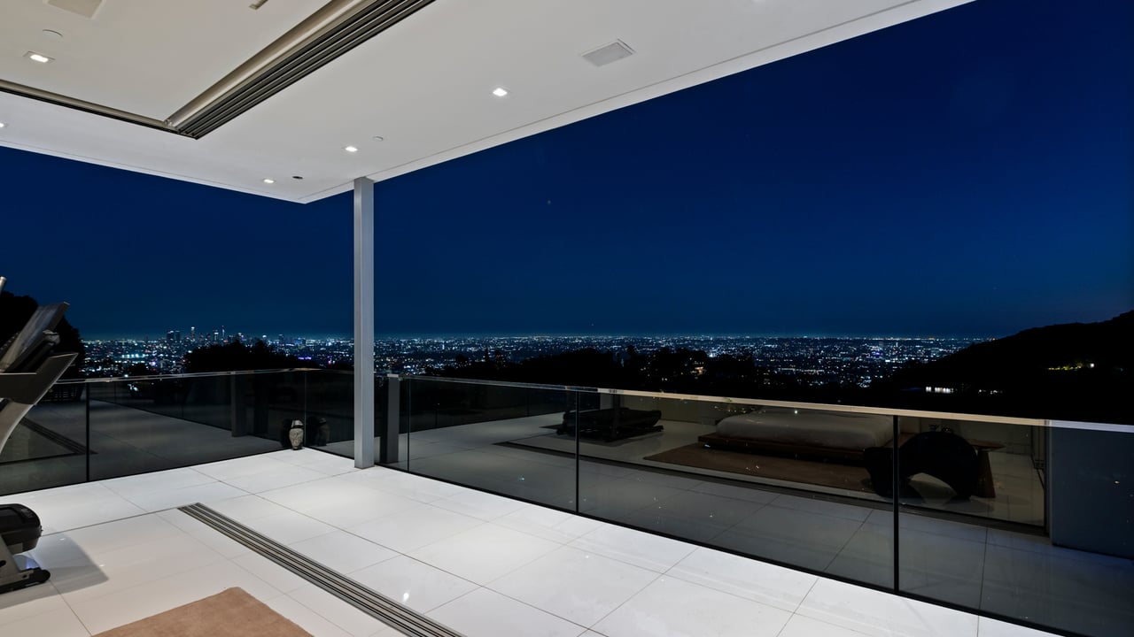 Set at the end of a private, gated drive, this architectural masterpiece offers unparalleled privacy and sweeping panoramic views stretching from Downtown LA to Catalina Island. Featuring three levels of seamless indoor-outdoor living, the home boasts polished white marble floors, floor-to-ceiling glass walls, and stunning vistas from every room. The first level includes a spacious lounge and luxurious bedroom suite. A floating staircase leads to the second level, where a chef's kitchen with high end appliances, custom European cabinetry, indoor/outdoor dining areas, and a private guest suite await. The lower level is a true retreat with two additional bedrooms, including a master suite with direct access to a resort-style infinity pool and swim-up bar. Expansive patios, lounging areas, and a cozy fireplace complete this extraordinary home, designed to captivate and elevate your lifestyle.