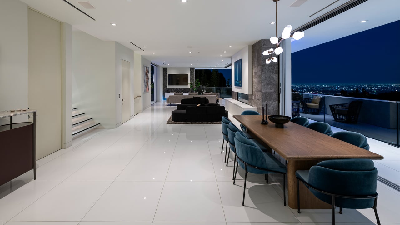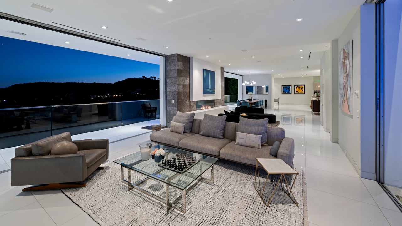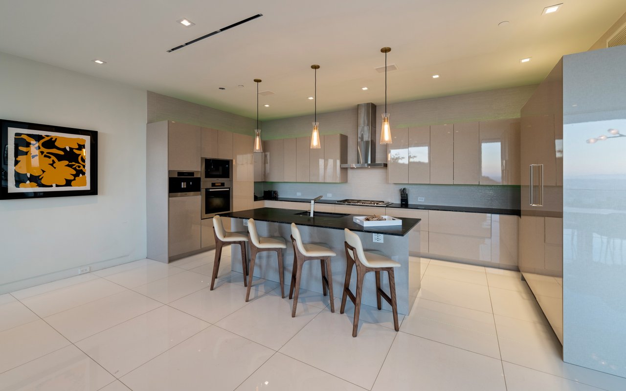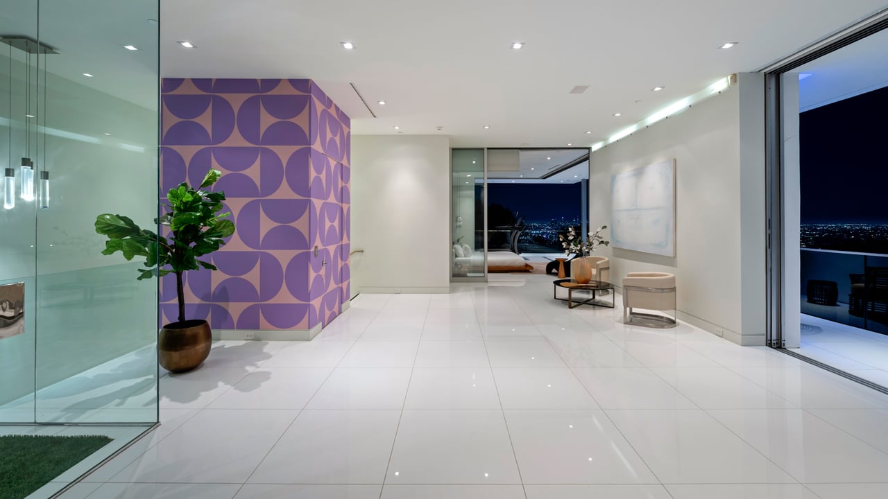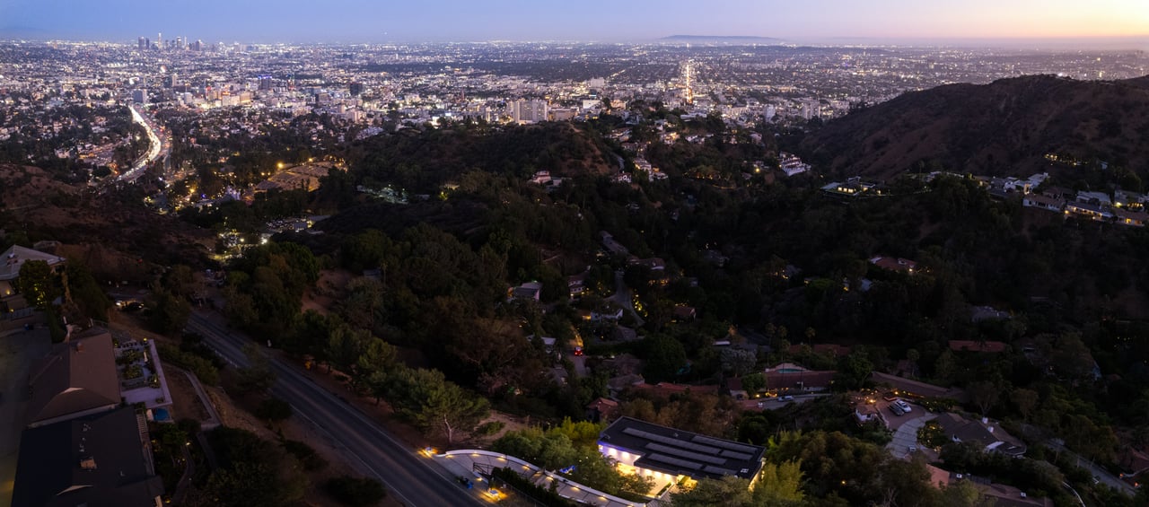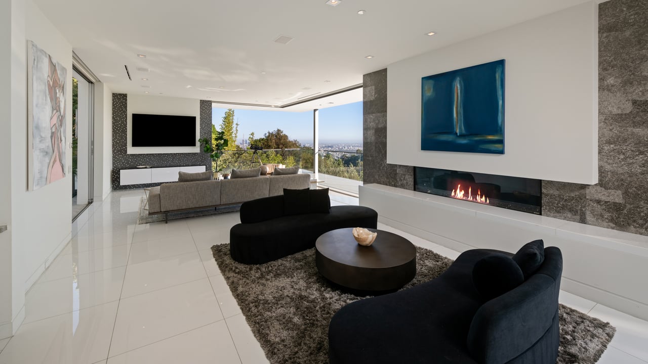 Set at the end of a private, gated drive, this architectural masterpiece offers unparalleled privacy and sweeping panoramic views stretching from Downtown LA to Catalina Island. Featuring three levels of seamless indoor-outdoor living, the home boasts polished white marble floors, floor-to-ceiling glass walls, and stunning vistas from every room. The first level includes a spacious lounge and luxurious bedroom suite. A floating staircase leads to the second level, where a chef's kitchen with high end appliances, custom European cabinetry, indoor/outdoor dining areas, and a private guest suite await. The lower level is a true retreat with two additional bedrooms, including a master suite with direct access to a resort-style infinity pool and swim-up bar. Expansive patios, lounging areas, and a cozy fireplace complete this extraordinary home, designed to captivate and elevate your lifestyle.