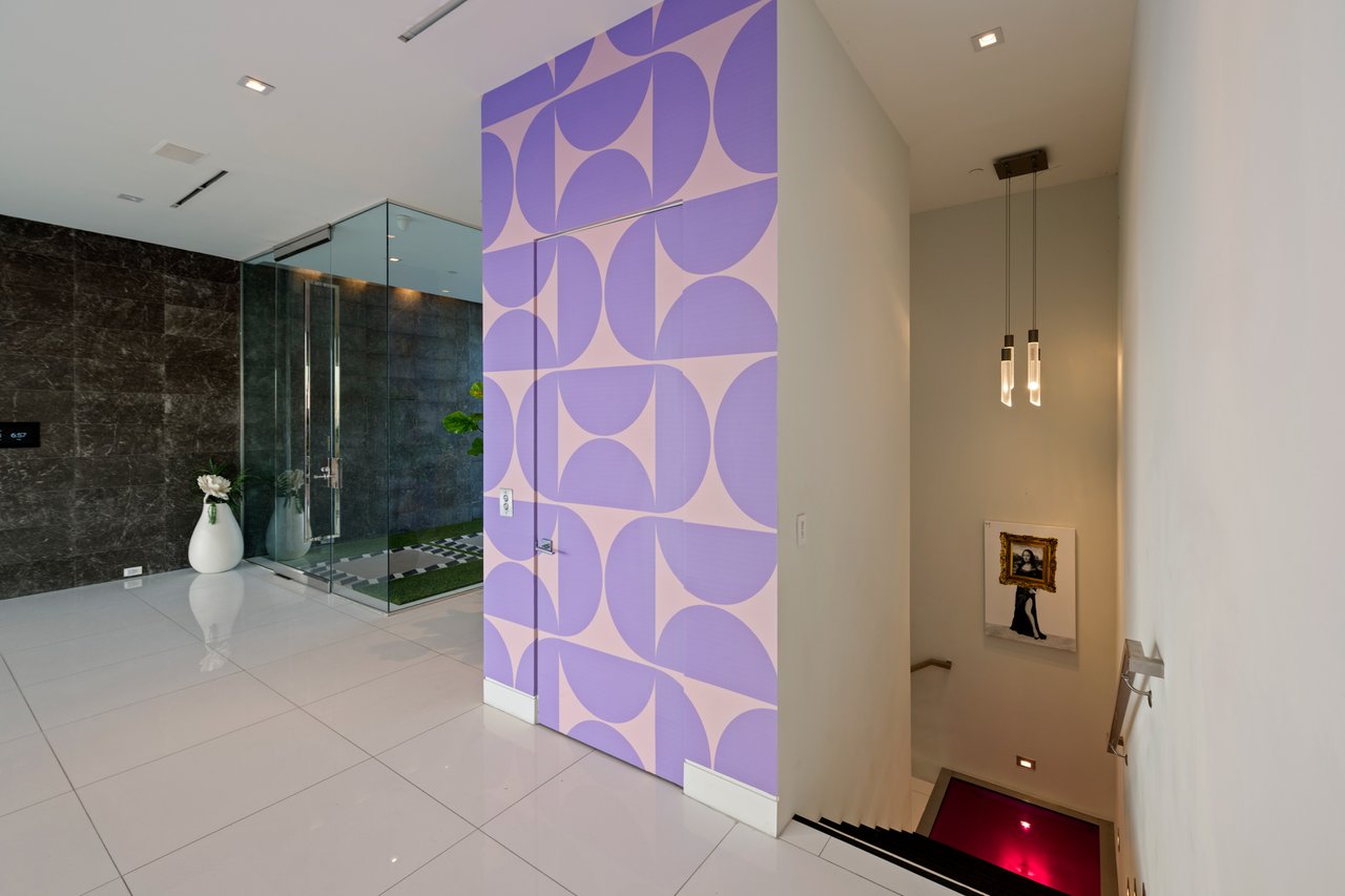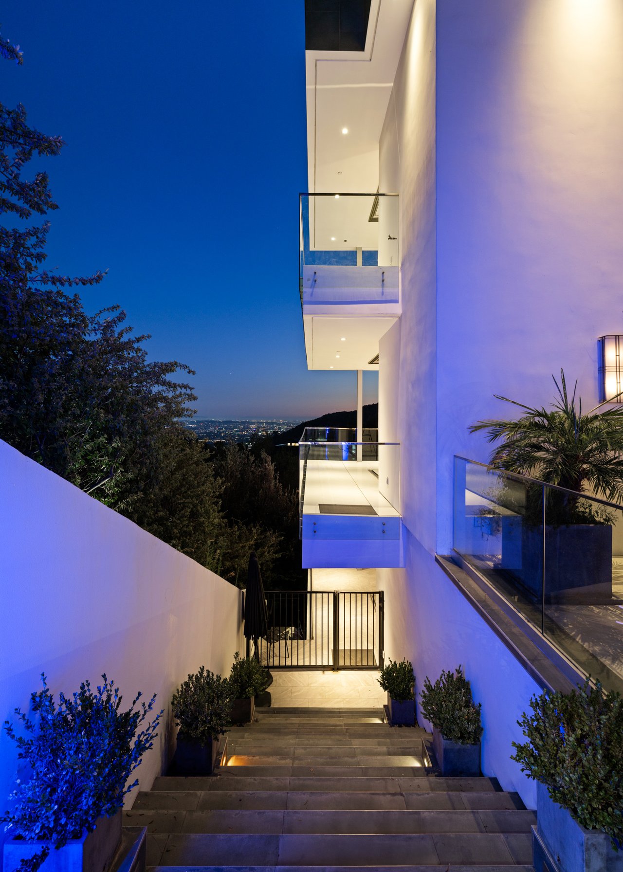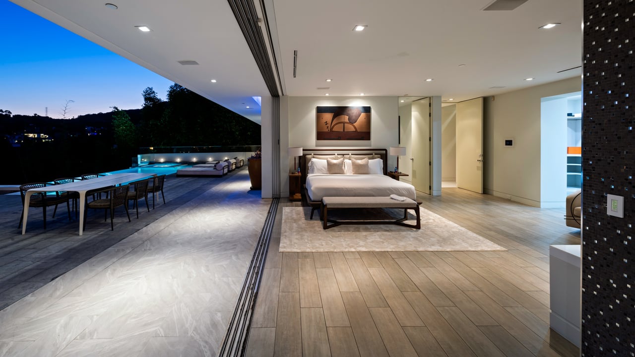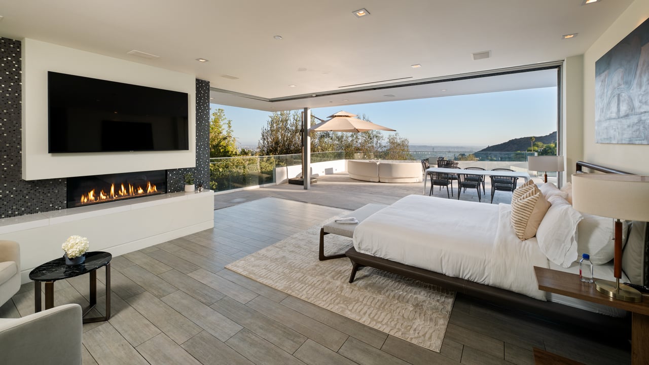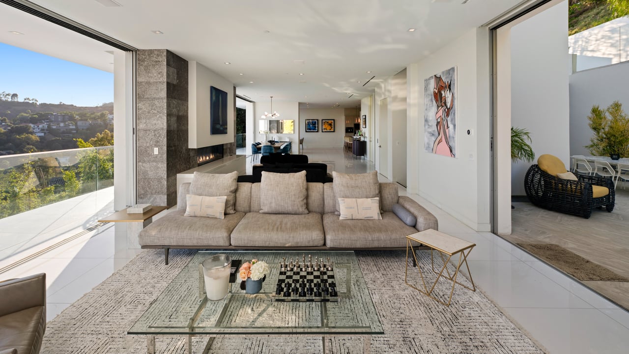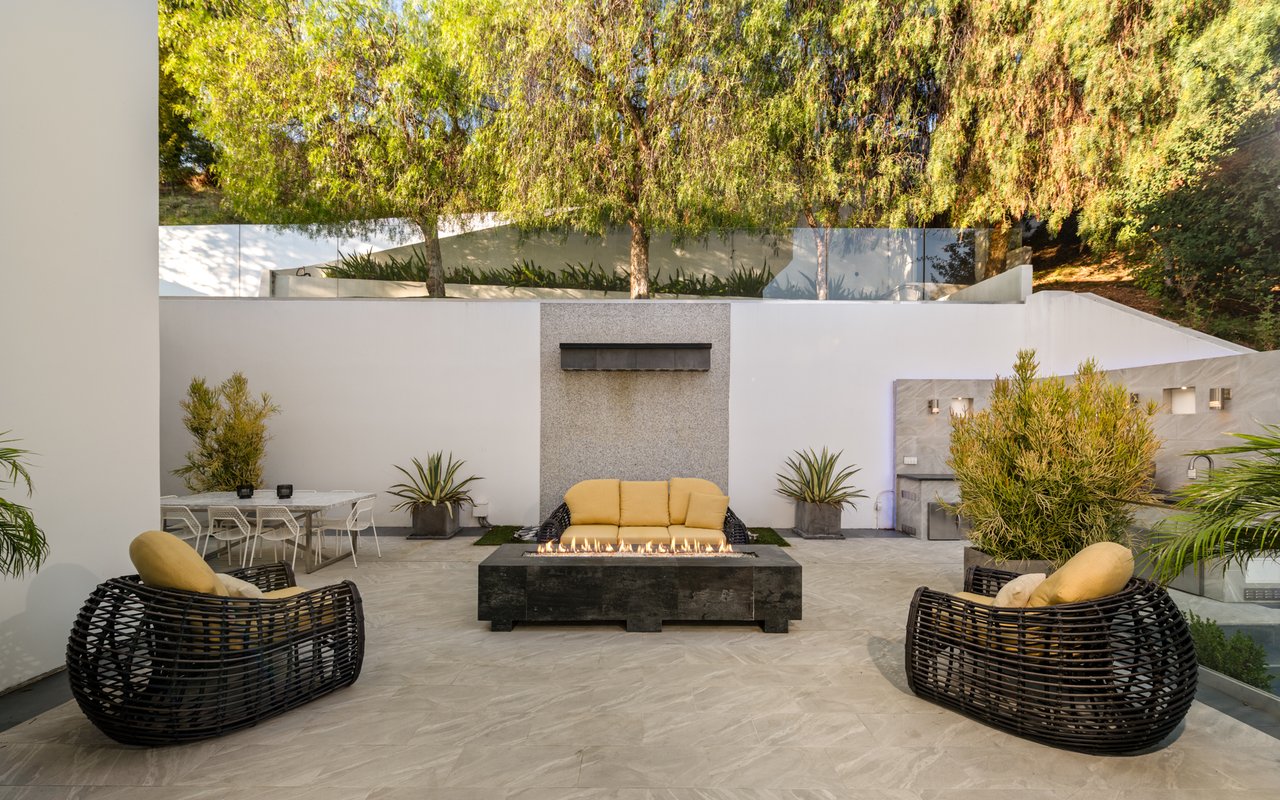 Set at the end of a private, gated drive, this architectural masterpiece offers unparalleled privacy and sweeping panoramic views stretching from Downtown LA to Catalina Island. Featuring three levels of seamless indoor-outdoor living, the home boasts polished white marble floors, floor-to-ceiling glass walls, and stunning vistas from every room. The first level includes a spacious lounge and luxurious bedroom suite. A floating staircase leads to the second level, where a chef's kitchen with high end appliances, custom European cabinetry, indoor/outdoor dining areas, and a private guest suite await. The lower level is a true retreat with two additional bedrooms, including a master suite with direct access to a resort-style infinity pool and swim-up bar. Expansive patios, lounging areas, and a cozy fireplace complete this extraordinary home, designed to captivate and elevate your lifestyle.