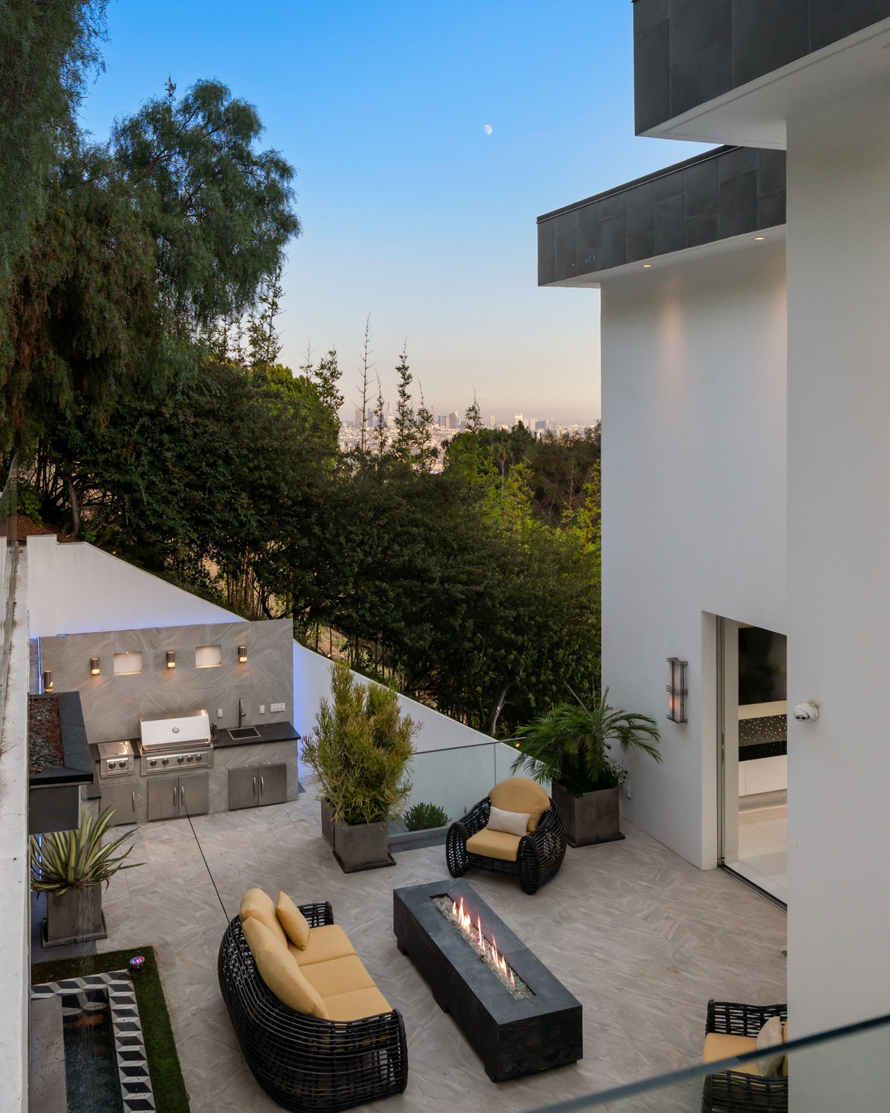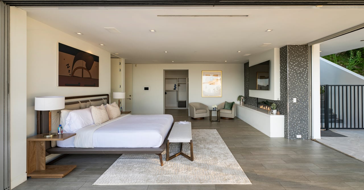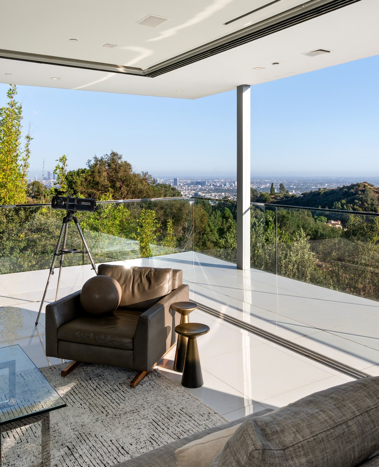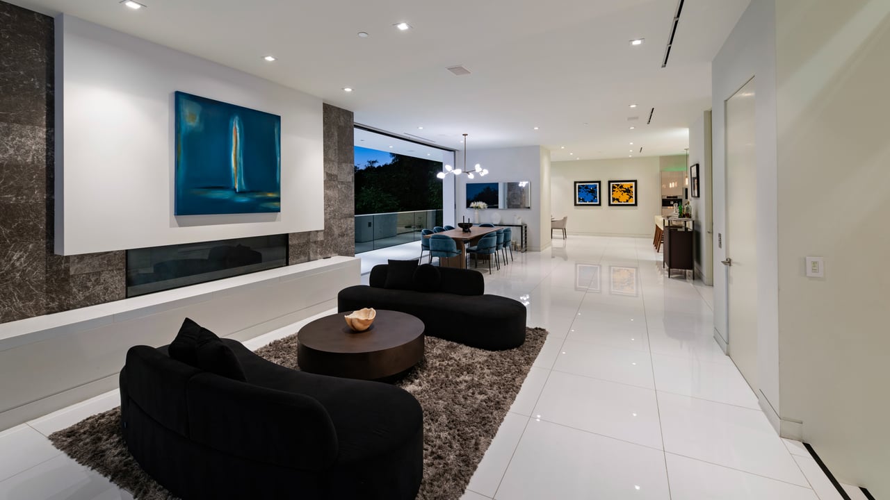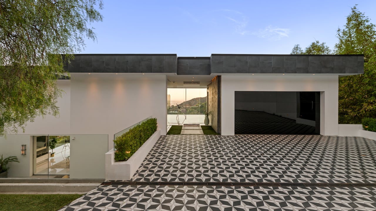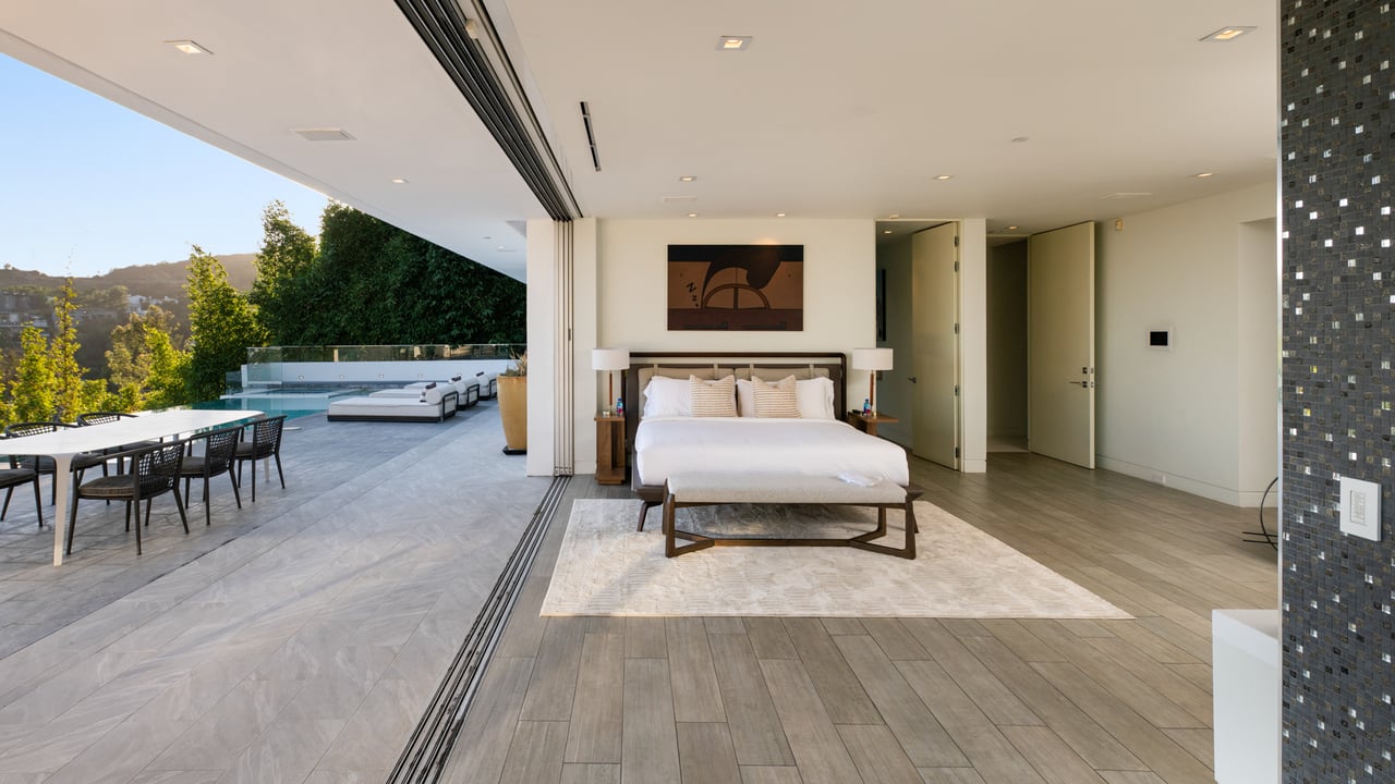 Set at the end of a private, gated drive, this architectural masterpiece offers unparalleled privacy and sweeping panoramic views stretching from Downtown LA to Catalina Island. Featuring three levels of seamless indoor-outdoor living, the home boasts polished white marble floors, floor-to-ceiling glass walls, and stunning vistas from every room. The first level includes a spacious lounge and luxurious bedroom suite. A floating staircase leads to the second level, where a chef's kitchen with high end appliances, custom European cabinetry, indoor/outdoor dining areas, and a private guest suite await. The lower level is a true retreat with two additional bedrooms, including a master suite with direct access to a resort-style infinity pool and swim-up bar. Expansive patios, lounging areas, and a cozy fireplace complete this extraordinary home, designed to captivate and elevate your lifestyle.