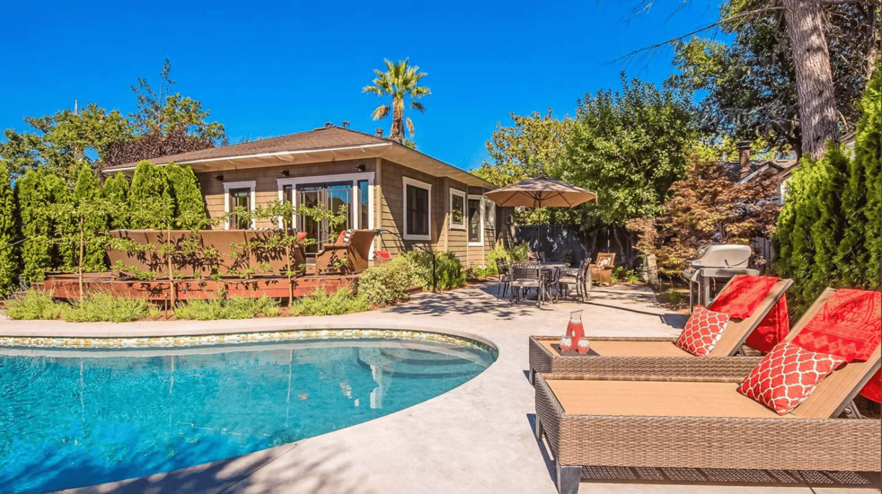 Charming and cozy cottage style home in Downtown Sonoma boasts a lush landscaped backyard where you can lounge by the pool, barbecue and dine at the al-fresco table. Glass doors connect the outdoor living areas to the fully equipped kitchen. From there, the living spaces flow in an L shape past a wet bar with a wine cooler, an inviting dining area with seating for six and a pretty sitting room with a gas fireplace.